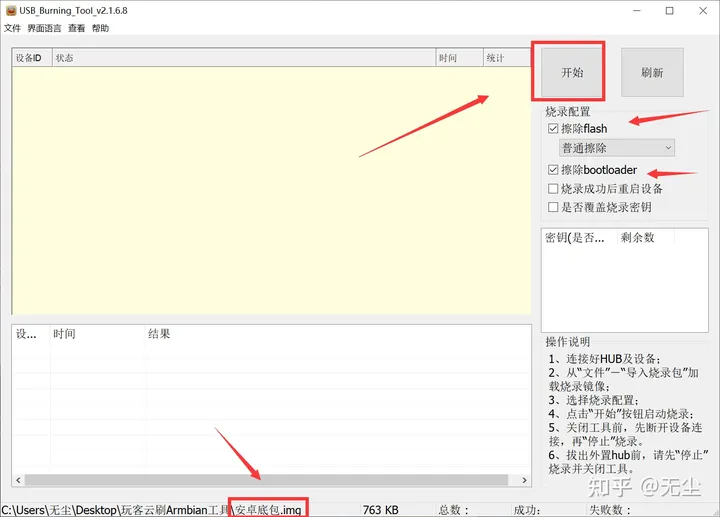 打开Amlogic.USB.Burning.Tool.v2.1.6.8,左上角点击文件-导入烧录包,选择Armbian_23.02.0-trunk_Onecloud_jammy_edge_6.1.9_minimal.burn.img 点开始